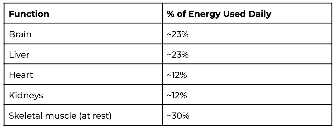 Resting Metabolic Rate (RMR): ~70% of daily energy needs. Includes: organ function, temperature